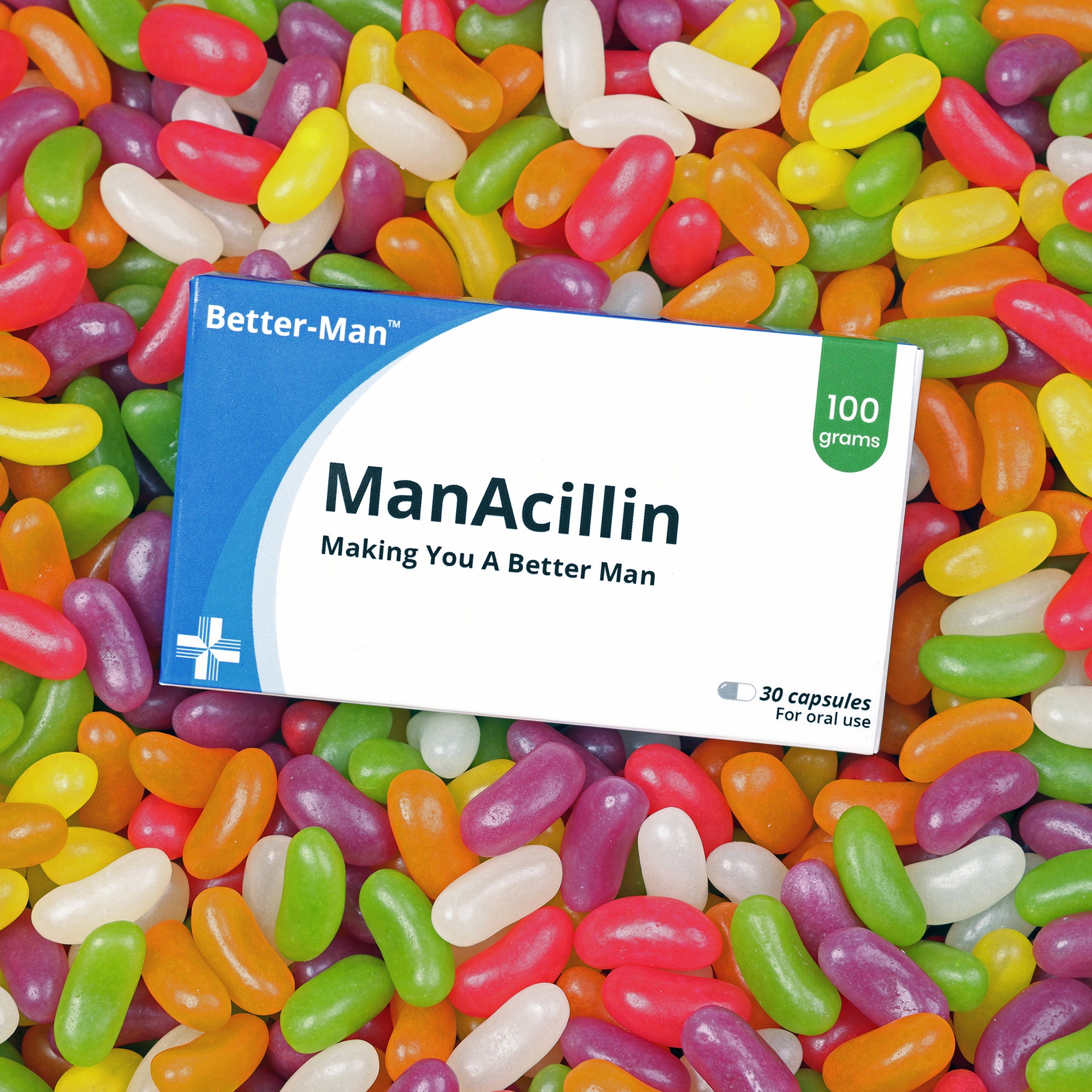 🍬 Open the box to find around 100 grams of scrumptious jelly bean sweets, turning a potential remedy into a delightful treat! The perfect blend of humor and sweetness, ManAcillin is the ultimate prescription for a memorable Valentine's Day.